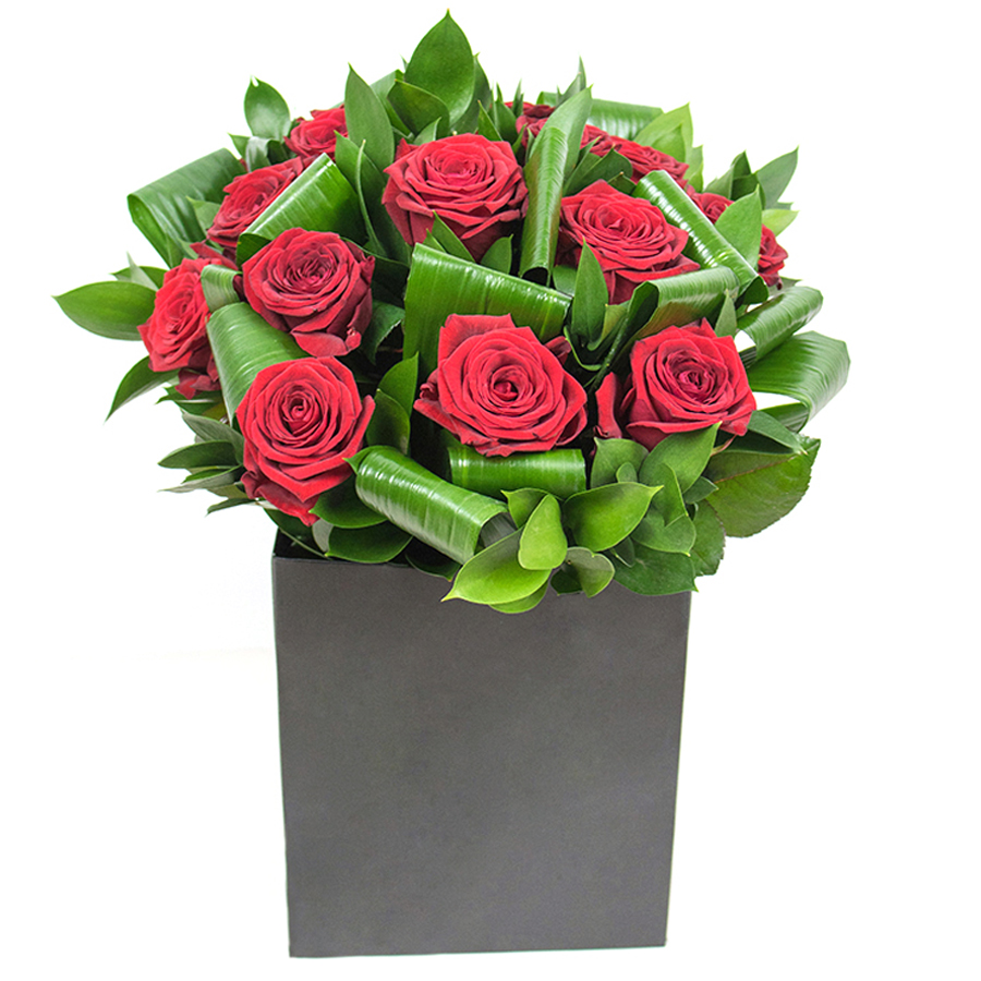 Immerse yourself in the beauty and sophistication of our elegant red roses bouquet. This lush arrangement features vibrant red roses paired with rich aspidistra leaves and graceful ruscus, creating a stunning focal point for any setting.